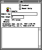 The info window displays three additional items, along with the standard file information: a "Read Only Topic" checkbox, an "Admin by" text box, and a "Max Msgs" text box. You will use these items to customize the topic.