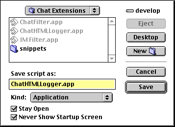 FilterDisplayChatMessage ( 'Fdcm' )- Prior to displaying a Chat Room Message, the Filtering application is sent the Filter Display Chat Message containing the following paramters.keyIMFromUser ( 'IMFr' ) - The name of the user sending the message to the Chat Room.keyChatChannel ( 'Chch' ) - The channel number the message was sent to.