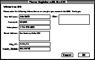 If you are not yet a registered user of the BBS or if your logon name is misspelled, your BBS will send you a message explaining what to do next. If you are already a user of the BBS, correct the name and password in the Connection window and try again. If you are a new user of the BBS, fill in the registration form to request an account.
